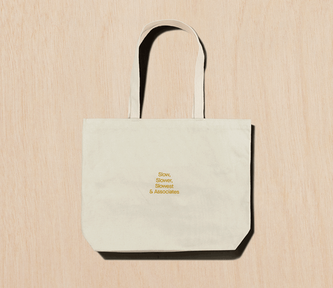 This oversized bag features our Dally logo in custom gold lettering on the front, and our “Slow, Slower, Slowest & Associates” signature design on the back. This sturdy cotton canvas tote comes with reinforced bottom paneling to help haul all of your belongings safely, no matter how much time you take along the way.